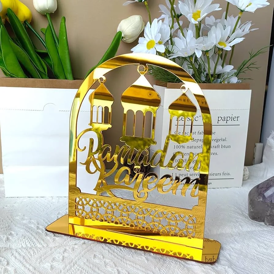 Cette décoration en acrylique et bois pour Ramadan Kareem représente une lanterne étoile et lune dorée, parfaite pour embellir votre table ou bureau pendant le mois sacré. Dimensions : 32×30 cm. Un ajout élégant et spirituel à votre décoration intérieure.